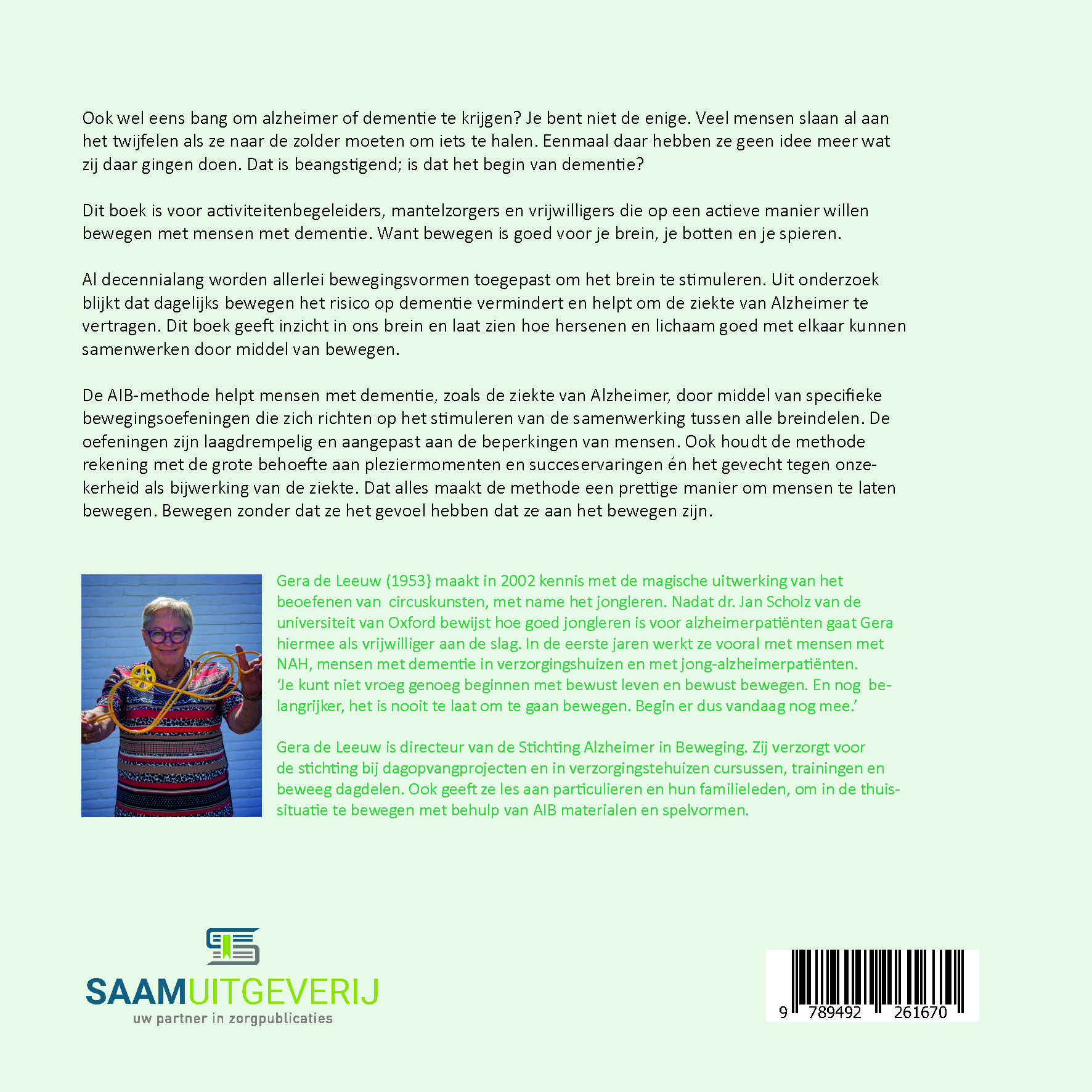 In dit boek Alzheimer in Beweging wordt de methode uitgelegd aan de hand van de theorie en de praktijk. Een overzichtelijk boek met kleurrijke tekeningen, voorbeeldoefeningen en bijzondere ervaringen uit de praktijk.