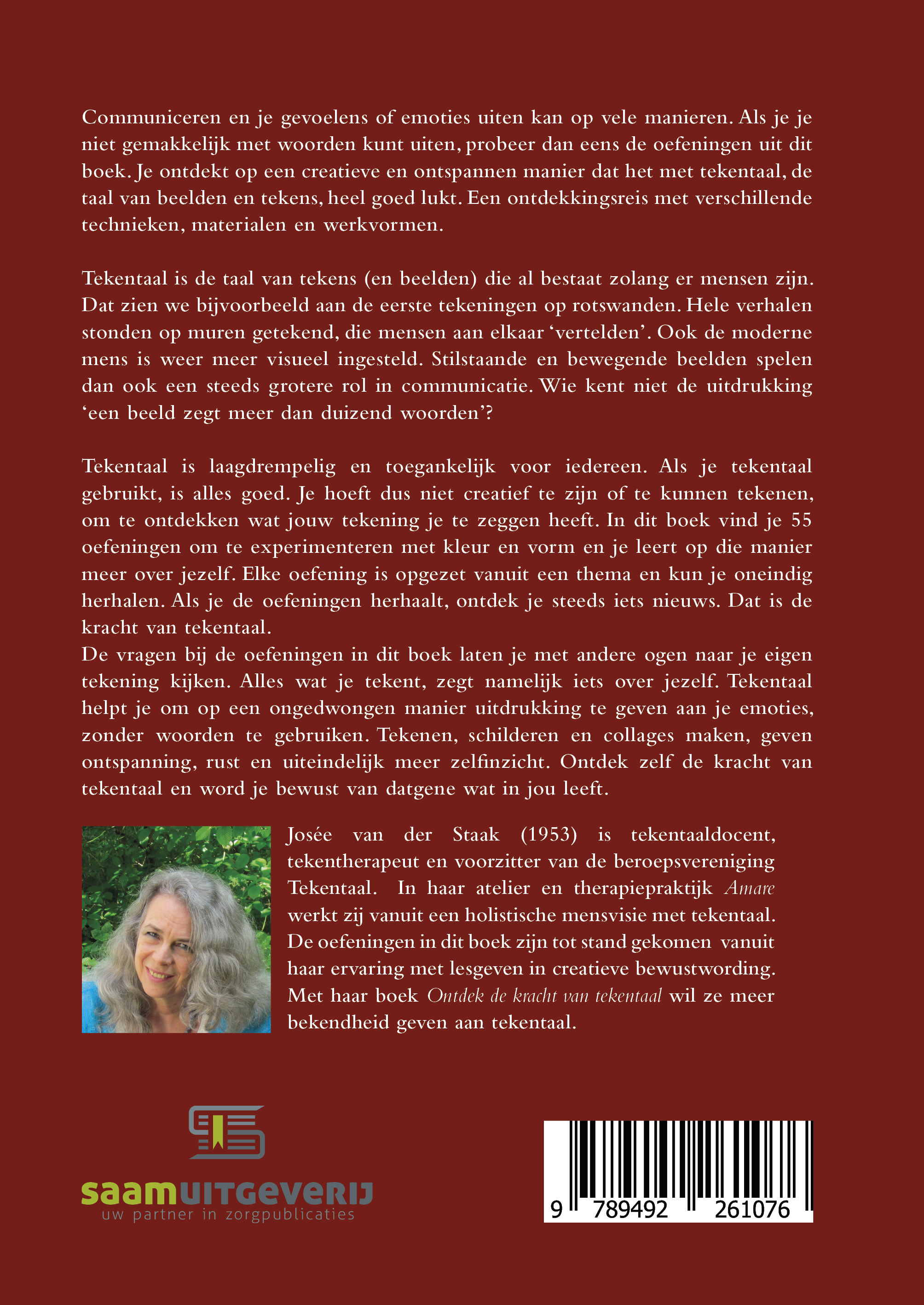 Josée van der Staak (1953) is tekentaaldocent, tekentherapeut en voorzitter van de beroepsvereniging Tekentaal. In haar atelier en therapiepraktijk Amare werkt zij vanuit een holistische mensvisie met tekentaal. De oefeningen in dit boek zijn tot stand gekomen vanuit haar ervaring met lesgeven in creatieve bewustwording. Met haar boek Ontdek de kracht van tekentaal wil ze meer bekendheid geven aan tekentaal. Kijk voor meer informatie op de website.